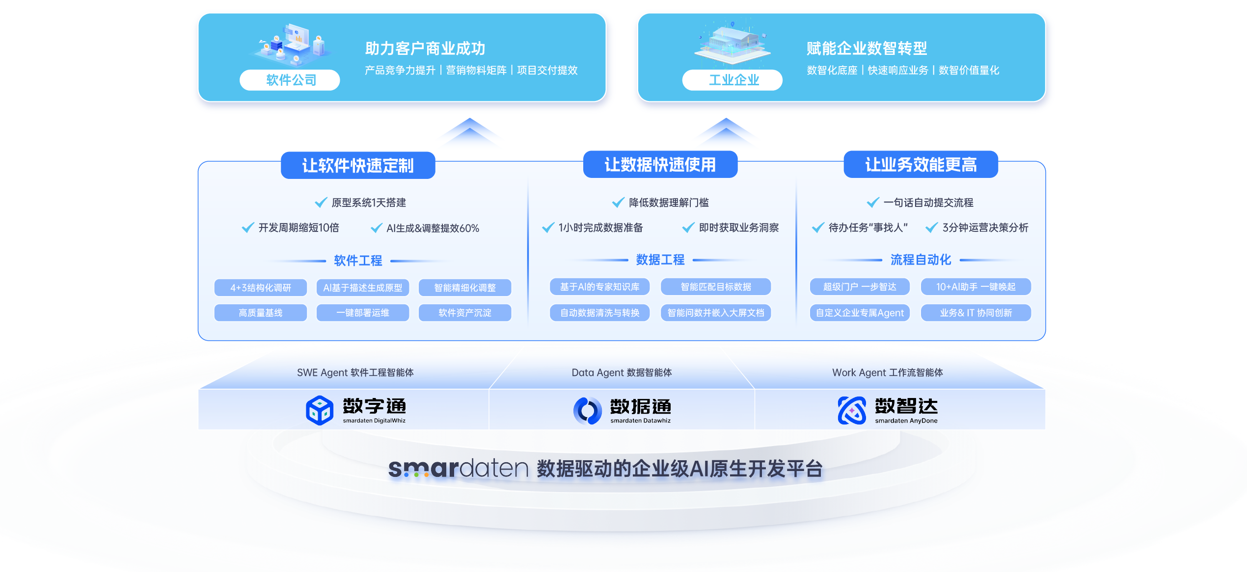 基于数智一体化底座 +运营支撑体系 +AI智能体矩阵 +超级门户四位一体,人人可参与的数智化转型新模式。